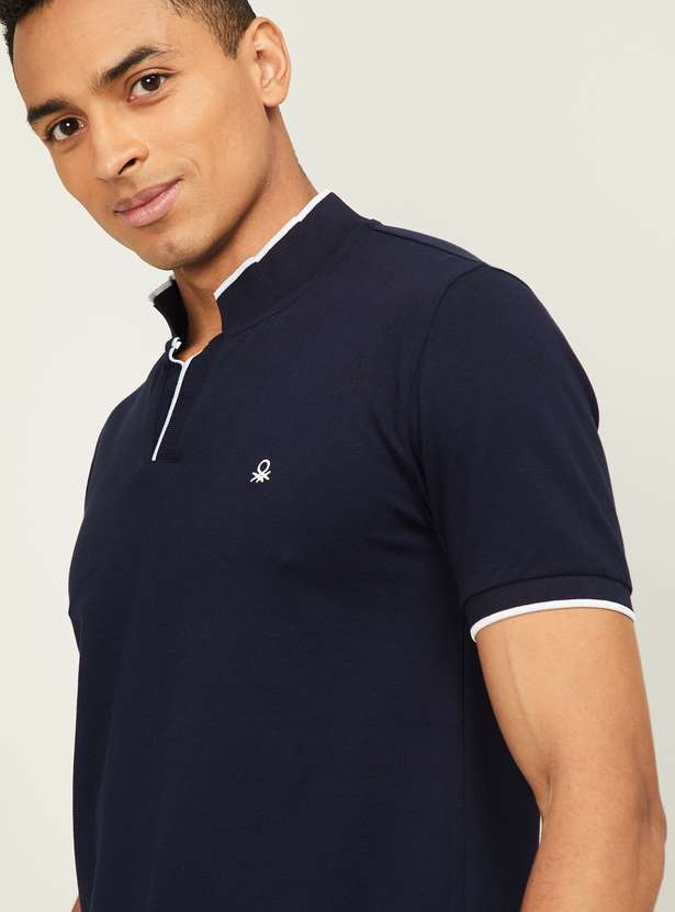 Enhance your basics with this solid T-shirt designed with a johnny collar and short sleeves.